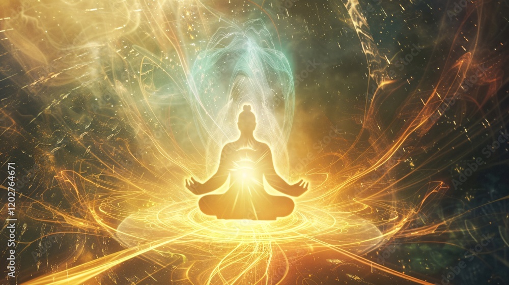 Harmony of energies depicted with light and energy fields around a meditating figure #1202764671