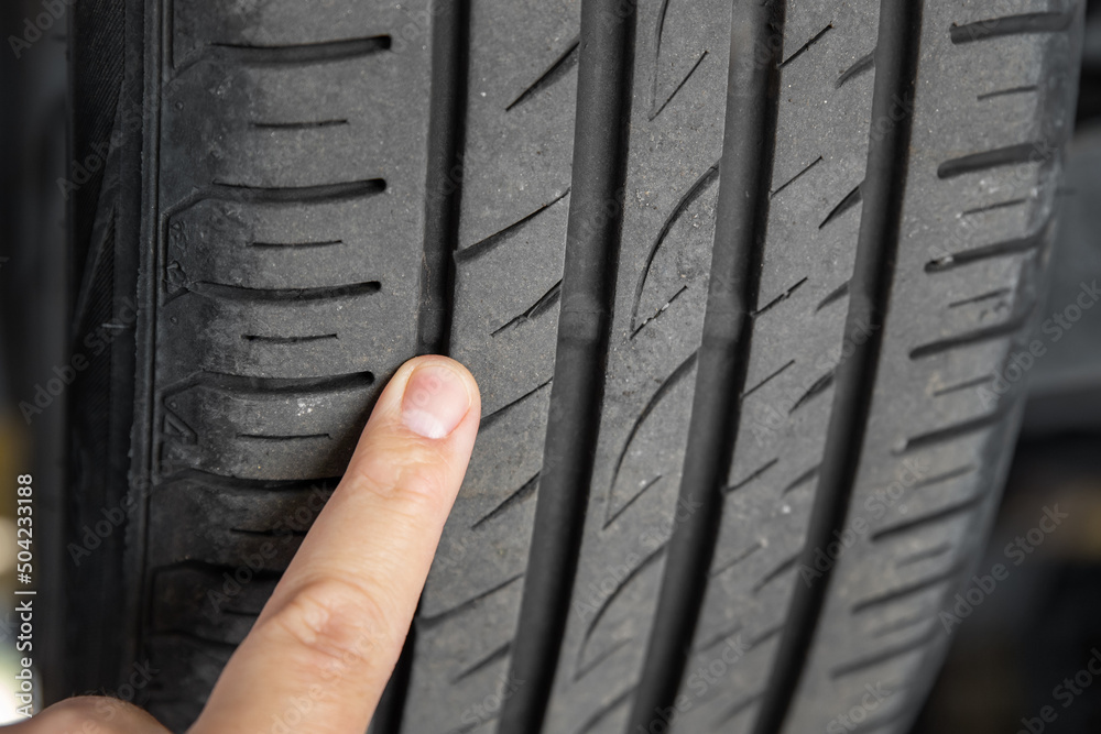 Mechanic pointing with hand at tyre wear indicator at car service center. Vehicle wheel protector control and inspection during maintenance. Tread wear check test inspection at automotive maintenance #504233188