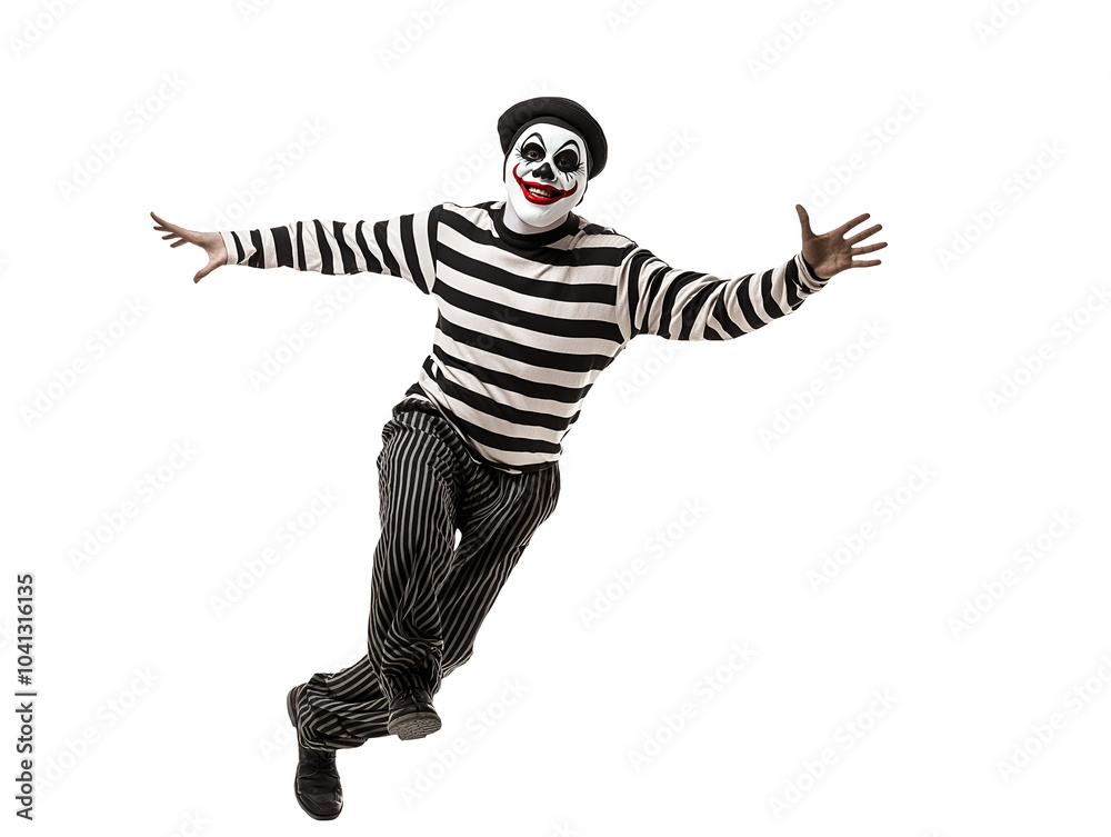mime performing a funny routine walking against the wind in black and white striped costume on isolated background #1041316135