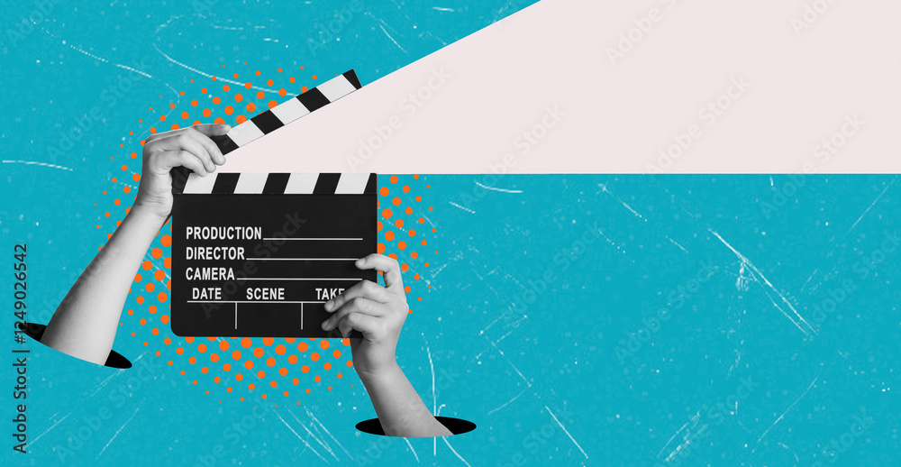 Modern art collage showing hands holding a clapper on a blue background with copy space. #1249026542