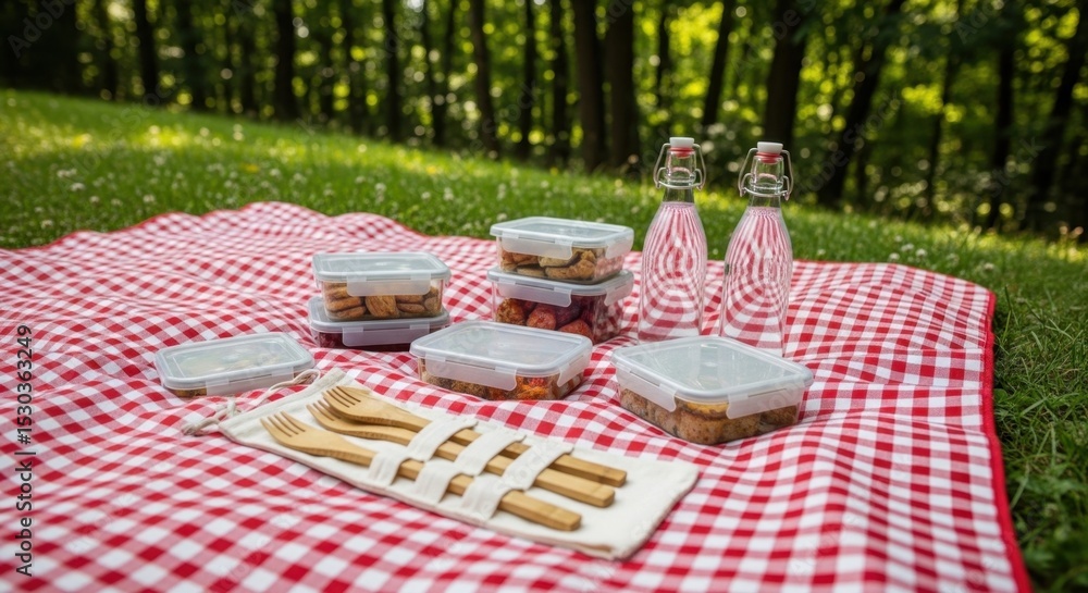 Outdoor picnic setup with red checkered blanket and packed food containers on grass #1530363249