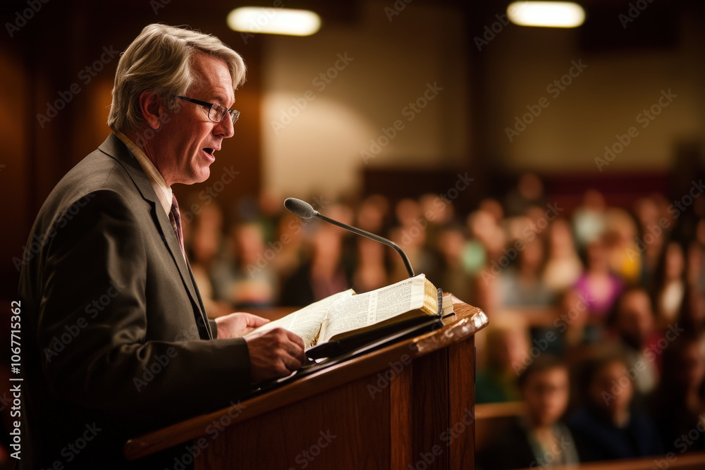 Pastor Delivering a Sermon at the Pulpit in Front of Congregation #1067715362