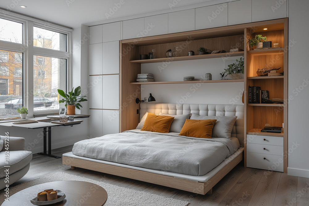 Photographie d’un studio étudiant au design minimaliste, équipé d’un lit escamotable, d’une table à manger pliable, de murs blancs épurés, et de rangements intégrés, espace de vie fonctionnel #1152457236