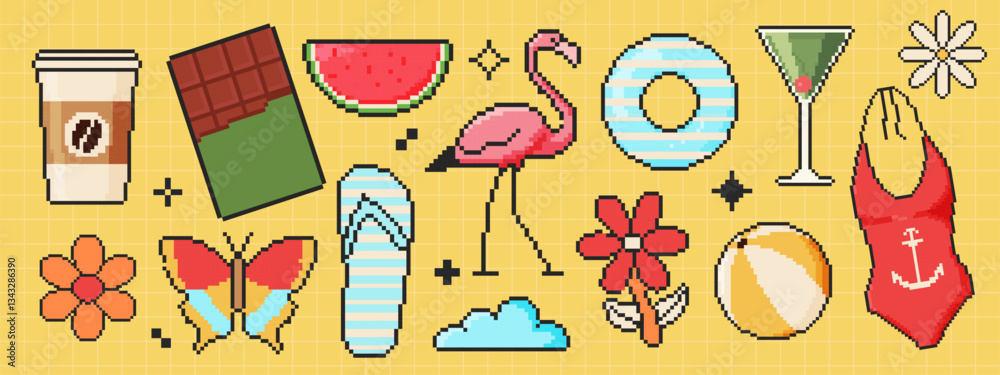 Pixel art summer icon set in 8 bit style. Retro 80s,90s video game graphics. Flamingo, lifebuoy, cocktail, swimsuit, ball, cloud, flower. #1343286390