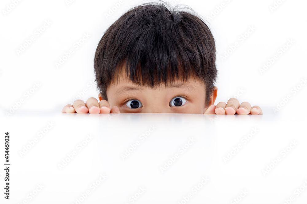 Portrait of an Asian boy peeking through the surface of table isolated on white background. #414451024