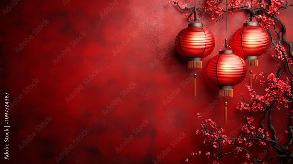 Red lanterns and red flowers create a vibrant scene, ideal for Chinese New Year, festive events, or cultural themed designs #1097724387