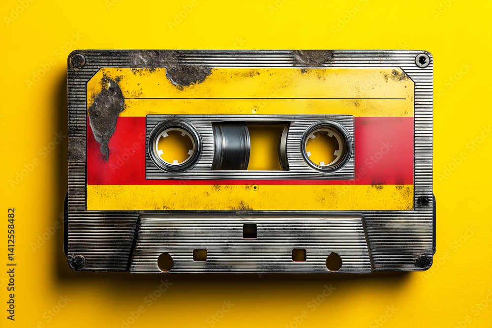 Retro Cassette Tape on Yellow Background in Minimalist Composition #1412558482