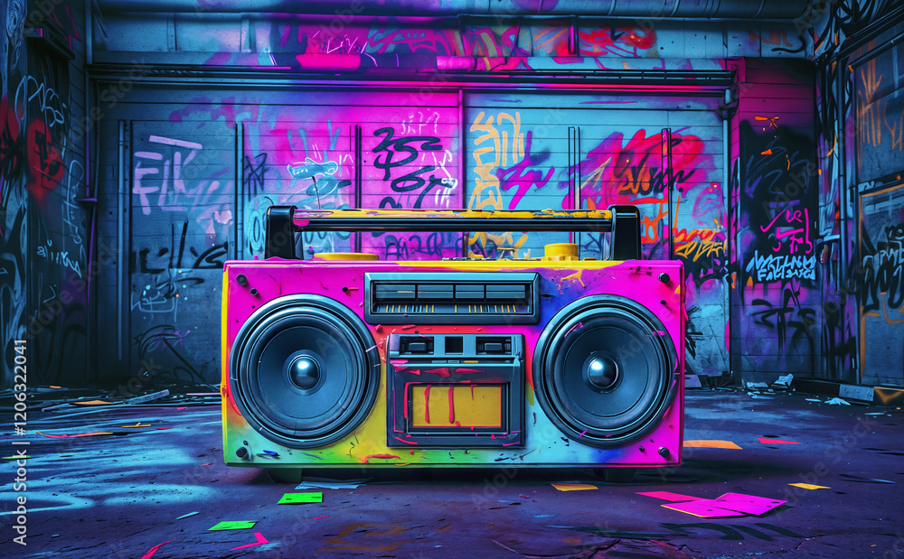 Retro old design ghetto blaster boombox radio cassette tape recorder from 1980s in a grungy graffiti covered room.music blaster #1206322041