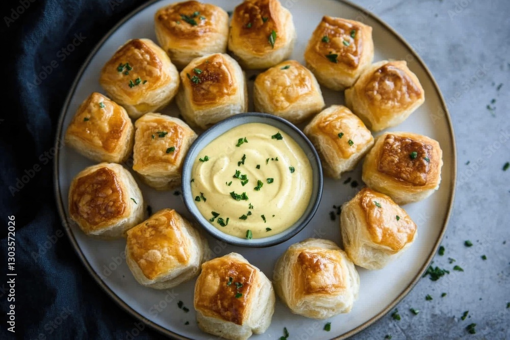 Savory puff pastry bites with cheese dip on gray plate garnished with parsley #1303572026
