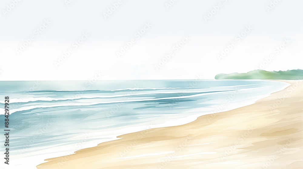 Secluded beach, gentle surf, empty shore, minimal Watercolor style #884297928