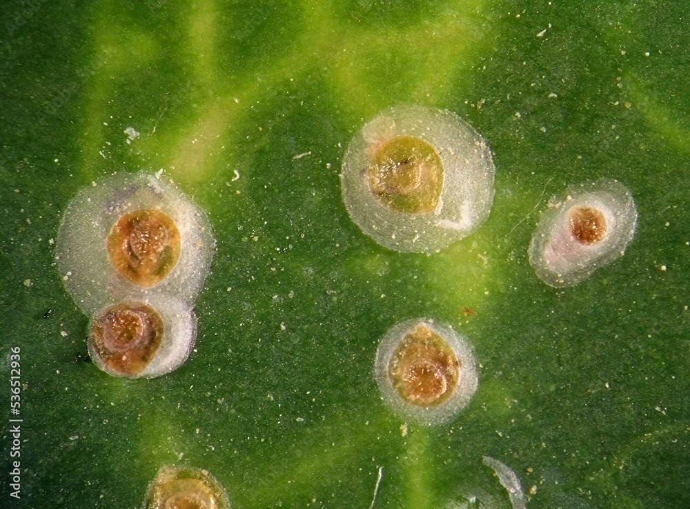 Soft scale insects, Oleander scale, Aspidiotus nerii (Hemiptera: Coccidae) on a green Hedera (ivy) leaf #536512936