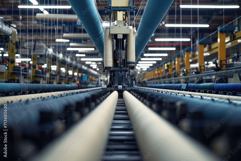 Spinning machines and looms in a textile manufacturing facility, depicting the process of transforming raw materials into fabrics #713685630