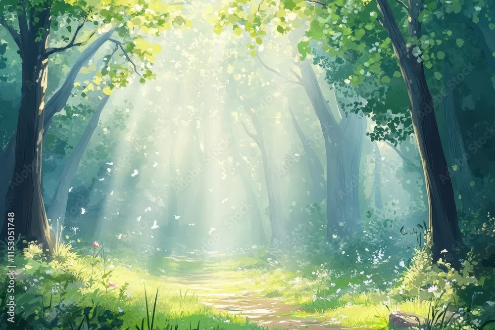 Sunbeams illuminate a magical forest path. (3) #1153051748