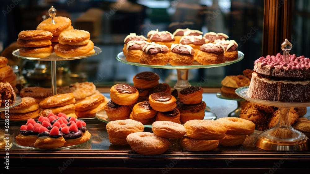 Sweet pastries with berries. Showcase in a candy store. Glass stand with cake eclairs and tartlets. refrigerator shelves with sweets. Confectioner's work space. #628672020