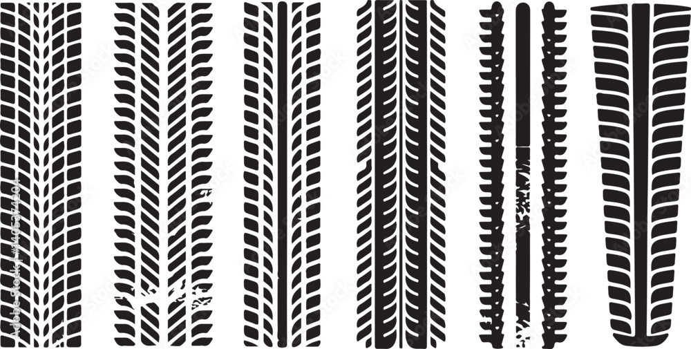 Tire tracks vector set black grunge car tire marks and wheel tread patterns for vehicle print, trail, off-road and automotive design #1405374204