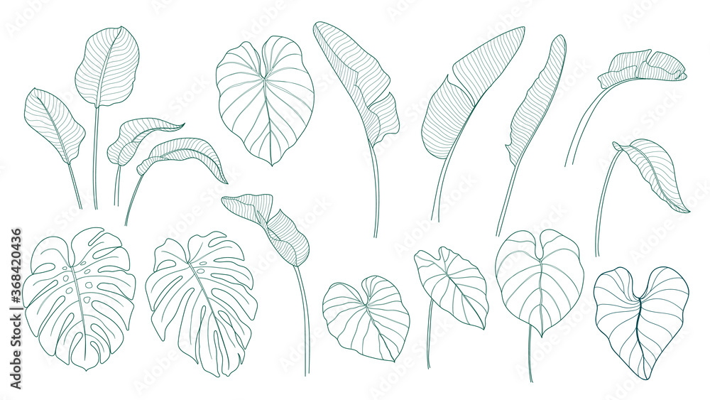 Tropical leaves vector collection. Set of silhouettes monochrome jungle exotic leaf, Philodendron, Palm leaves, Areca palm, Royal fern, Banana leaf isolated on white background. Vecor illustration #368420436