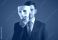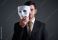 Two faces, holding mask and businessman portrait in a studio with serious face with secret and fraud. Worker or corporate criminal with rope tie showing identity theft or liar in business suit mockup #604775738