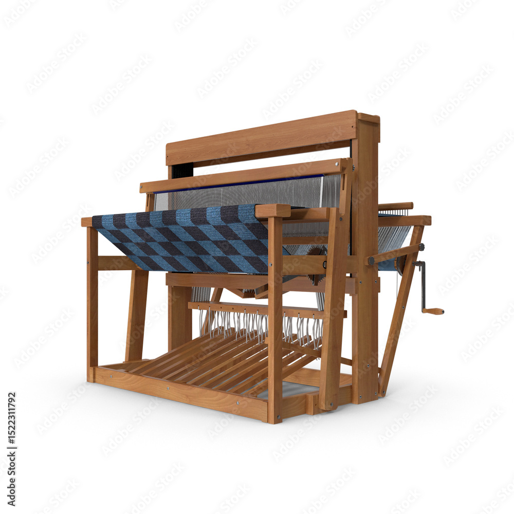 Wooden Floor Loom with Blue Checkered Fabric in Progress Isolated on Transparent Background #1522311792