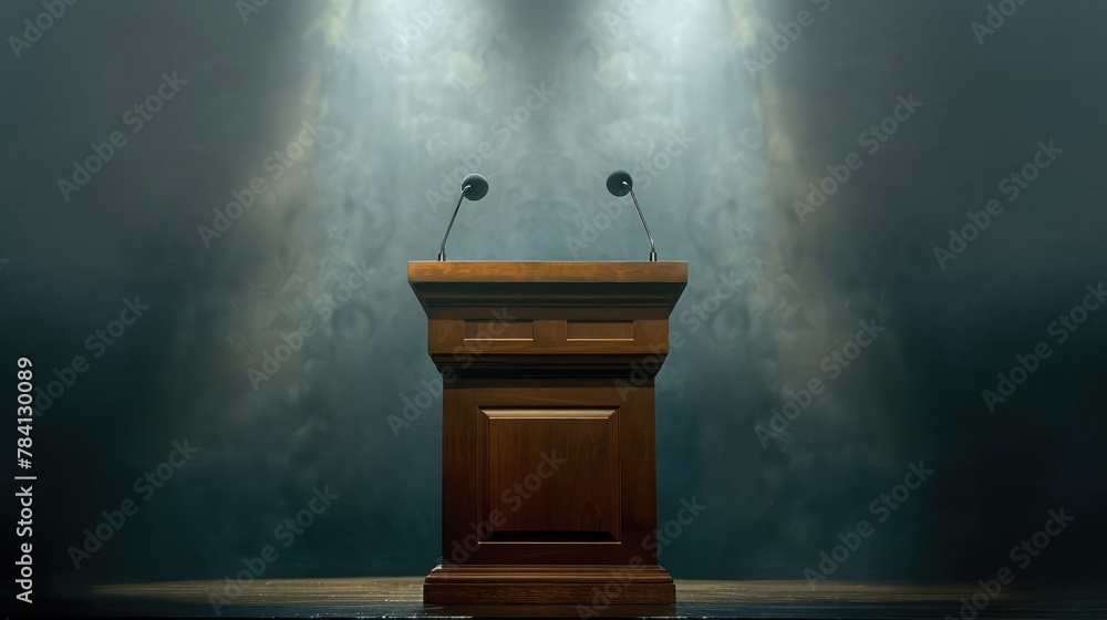wooden speech podium with three small microphones attached on a dark background spotlit #784130089
