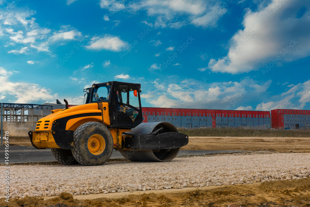 Yellow road roller compactor working on gravel at a construction site with a red and gray industrial building in the background. #1499169478