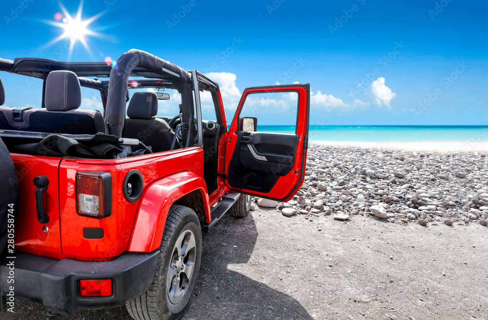 A red jeep on sandy beach and beuatiful blue sunny sky view in summer time. #280558744