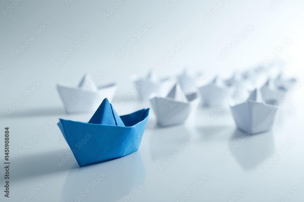 A single blue paper boat leads a fleet of white ones on a reflective surface, concept for business leadership and innovation #1451908884