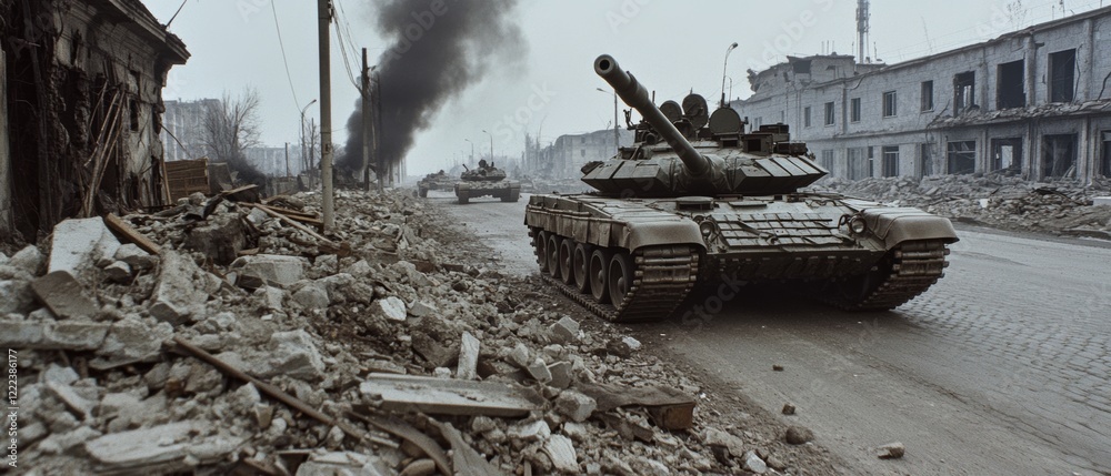 A tank navigates through a desolate, war-torn urban landscape, with smoke rising from surrounding ruins, capturing the somber essence of conflict. #1222386177