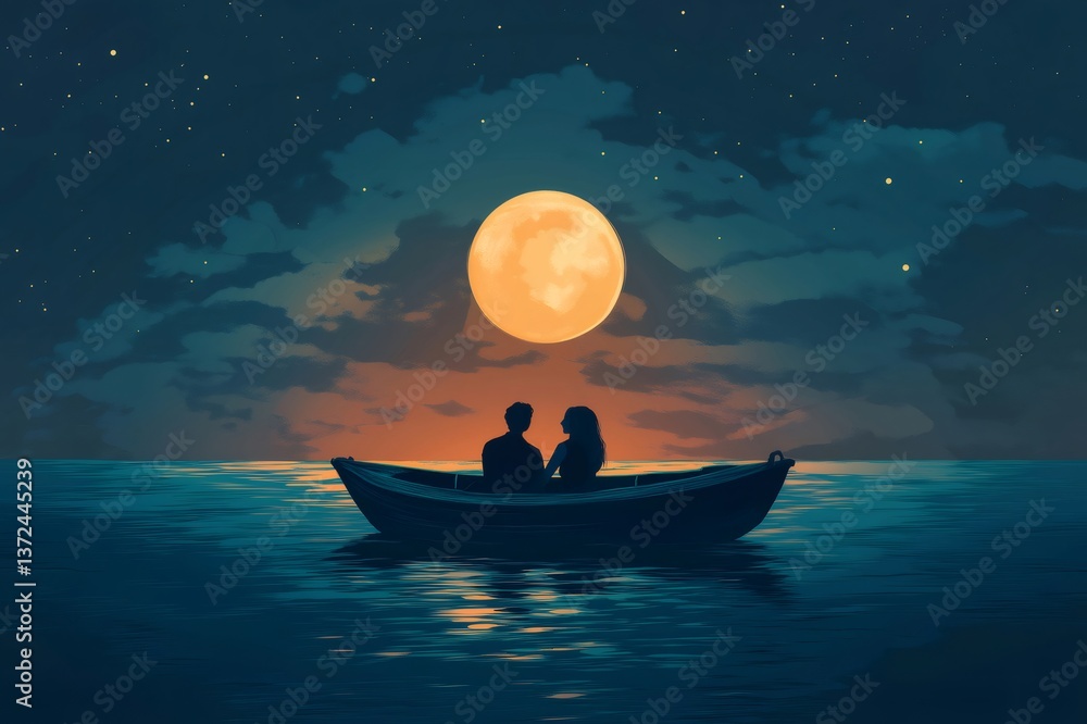 Couple sharing romantic moments while gliding on a boat under a luminous full moon and a breathtaking starry sky #1372445239