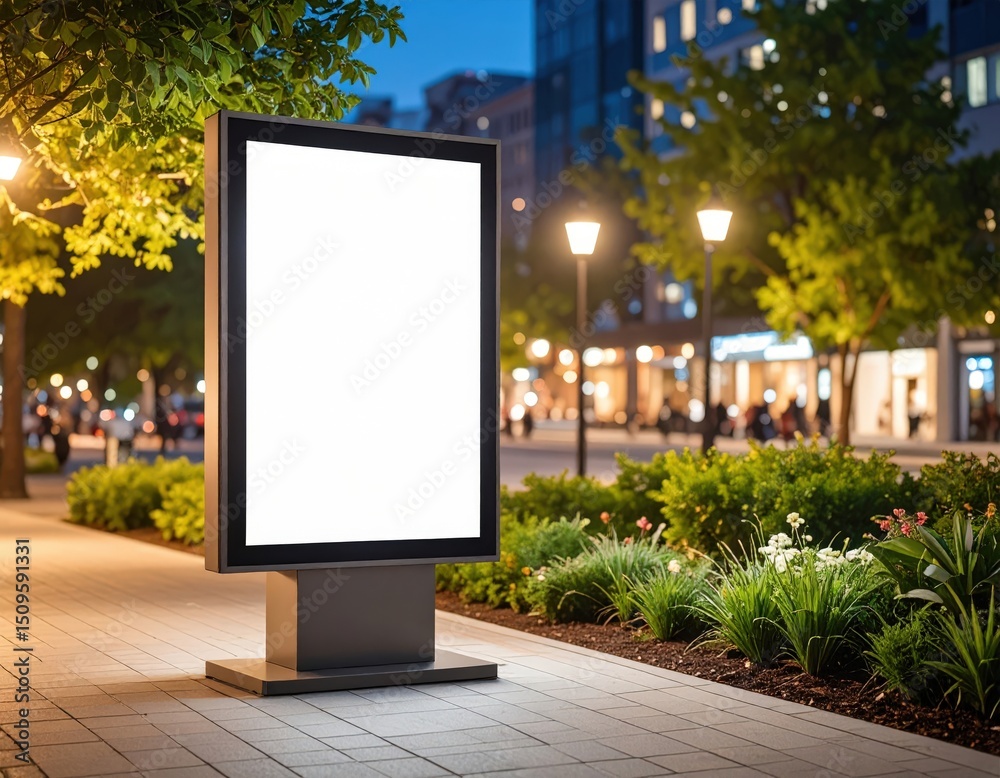 Illuminated blank billboard stands on a city sidewalk at dusk ready for advertising (1) #1509591331