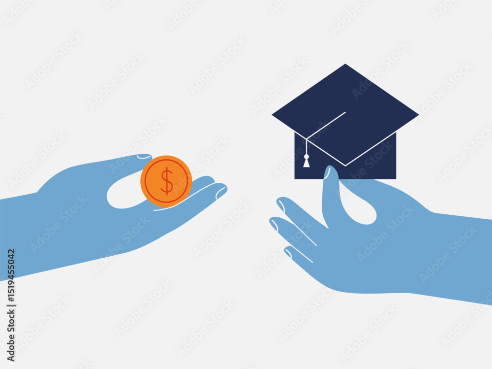 Invest in future study in university or college. cost and financial availability of higher education in the world. Human Hands with coin and mortarboard. Vector illustration #1519455042