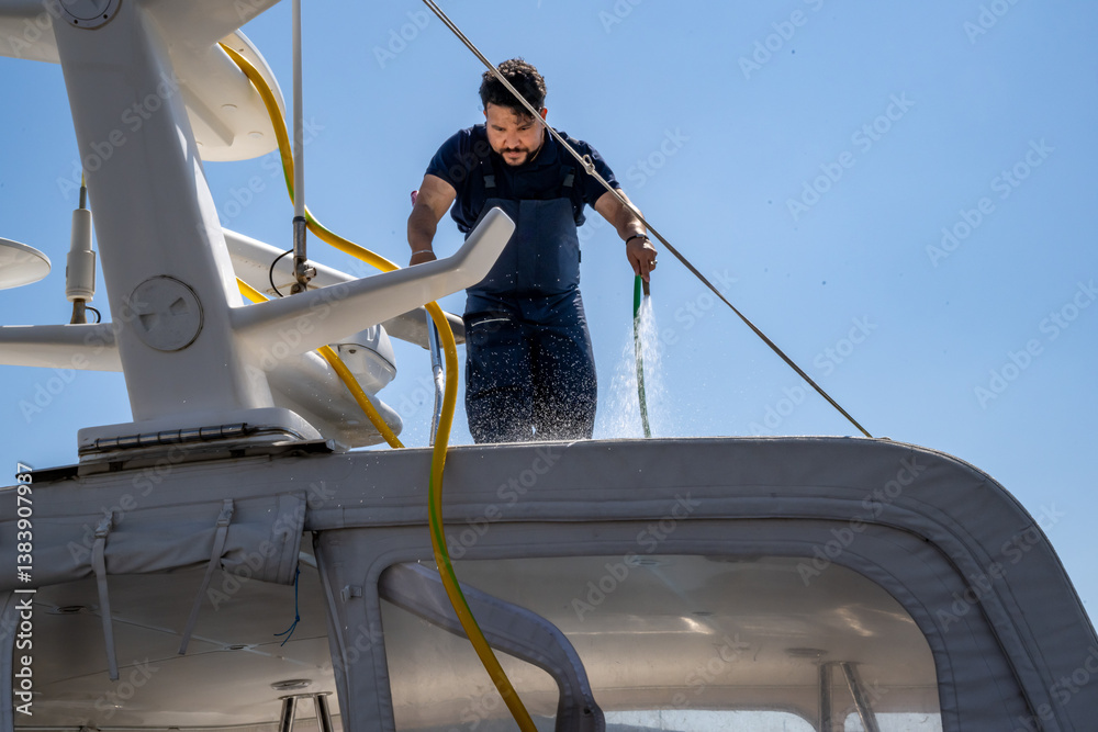 Luxury yacht being cleaned by a professional worker at the dock. Boat maintenance service in action at a marina with a bright summer sky and moored vessels. #1383907937