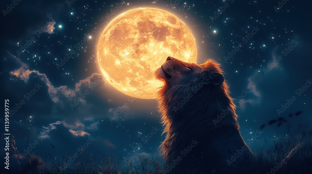 Majestic lion howling at a luminous full moon under a starlit sky in the serene night #1139959775