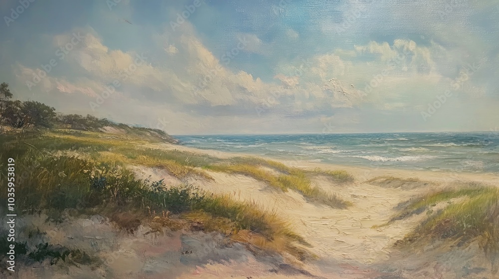 Oil painting depicting scenic views of a coastal landscape with dunes and greenery #1035953819