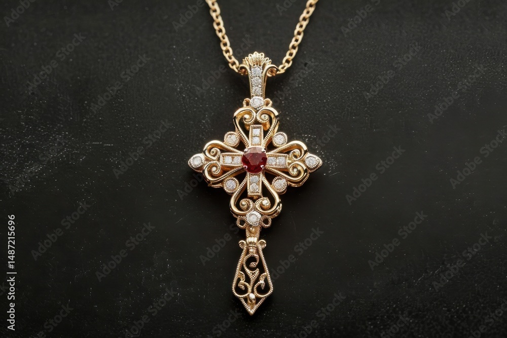 Renaissance-style ruby and diamond cross pendant with yellow gold filigree work and ornate details, dramatic side lighting blur. #1487215696