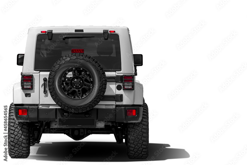 Silver jeep , back view. Expensive jeep on a white background for your design #458654565