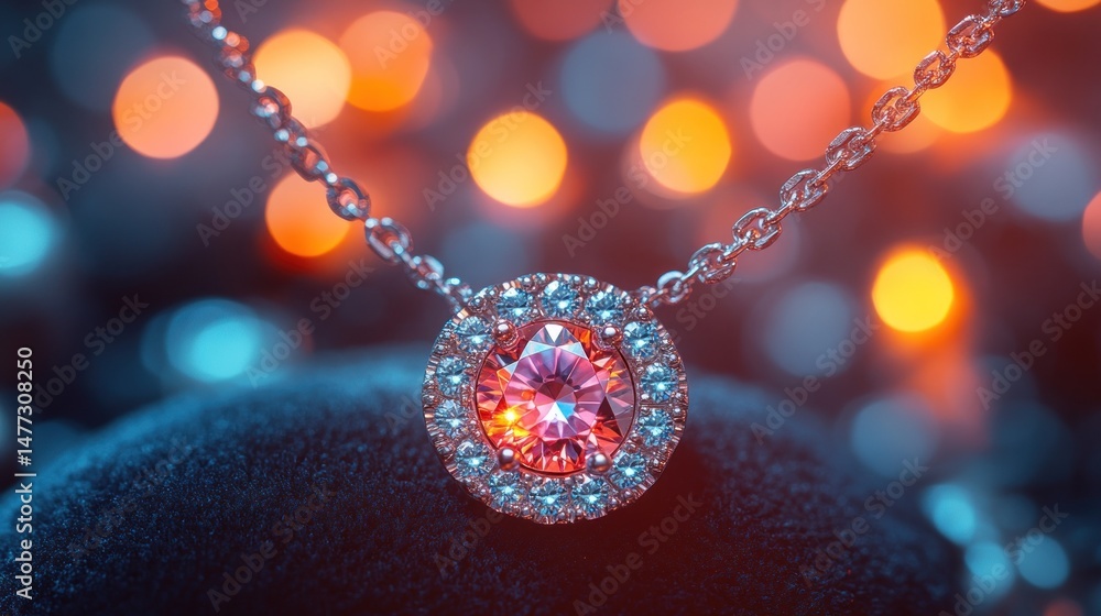 Sparkling diamond pendant necklace on dark background with bokeh lights. #1477308250
