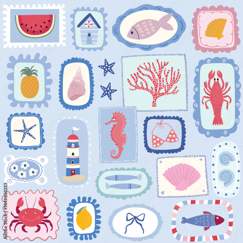 Summer marine seamless pattern, coquette background with stamps, charming wallpaper with lobster, coastal elements #1449650253