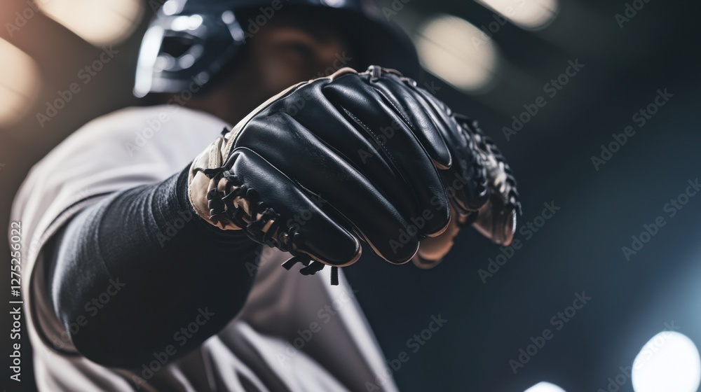 A baseball batter adjusting their batting gloves before a playoff pitch. Featuring focus and preparation #1275256022