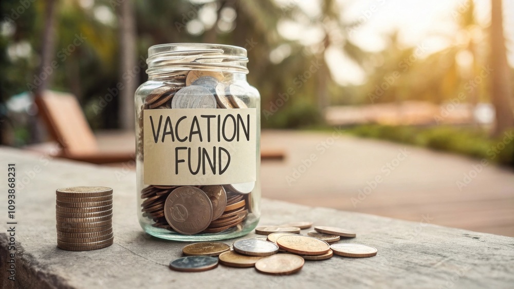 A jar filled with coins and a label Vacation Fund on the table showing the goal of saving for leisure. #1093868231