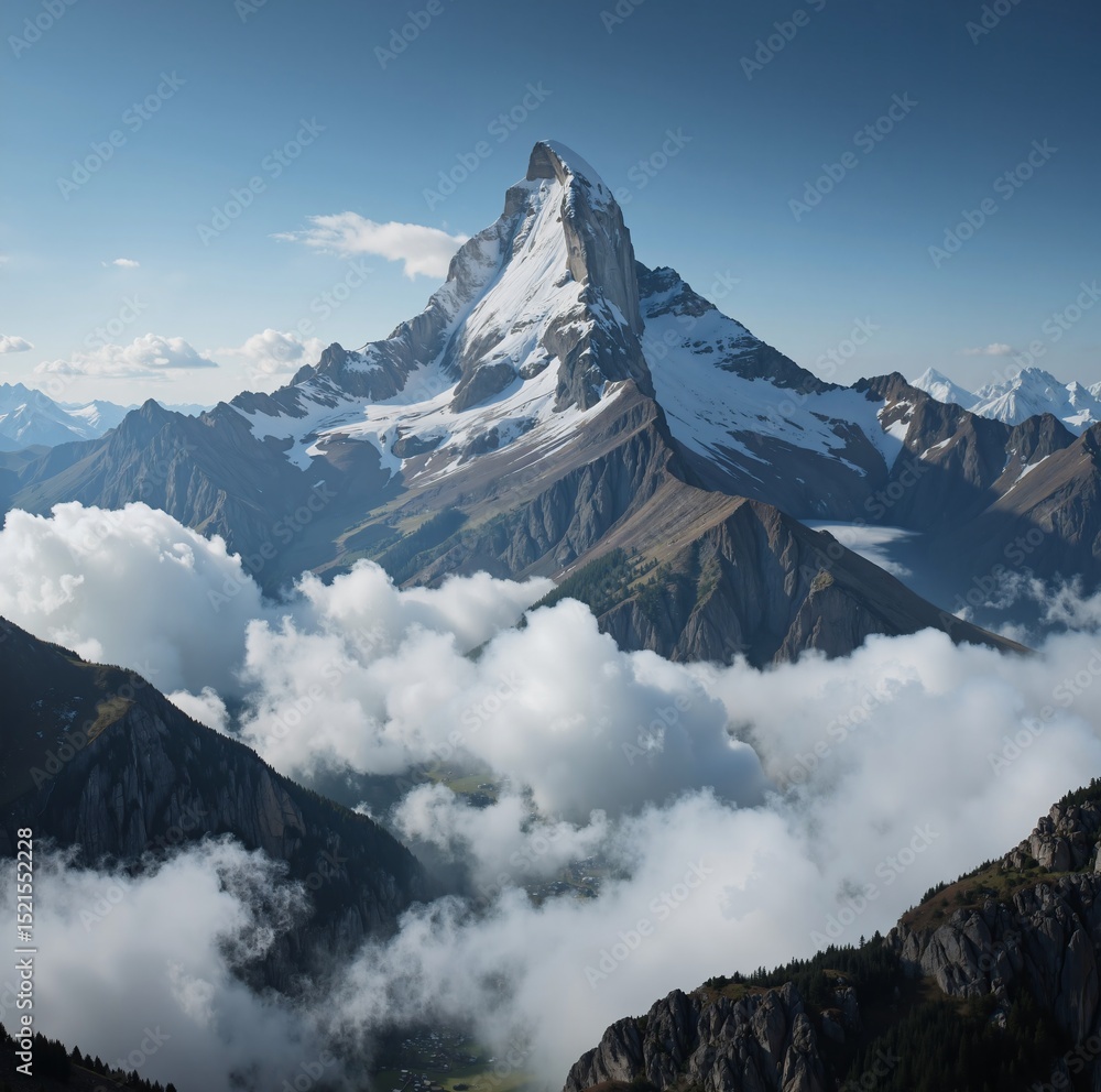 A majestic mountain peak emerges from a blanket of clouds, surrounded by a vast mountain range under a clear blue sky #1521552228