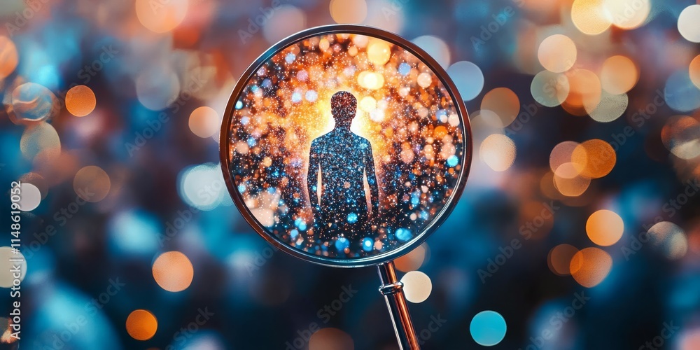 A meticulously crafted magnifying glass highlights a striking digital silhouette of a human figure, symbolizing the quest for individuality among a vibrant crowd of diverse characters and stories #1148619052