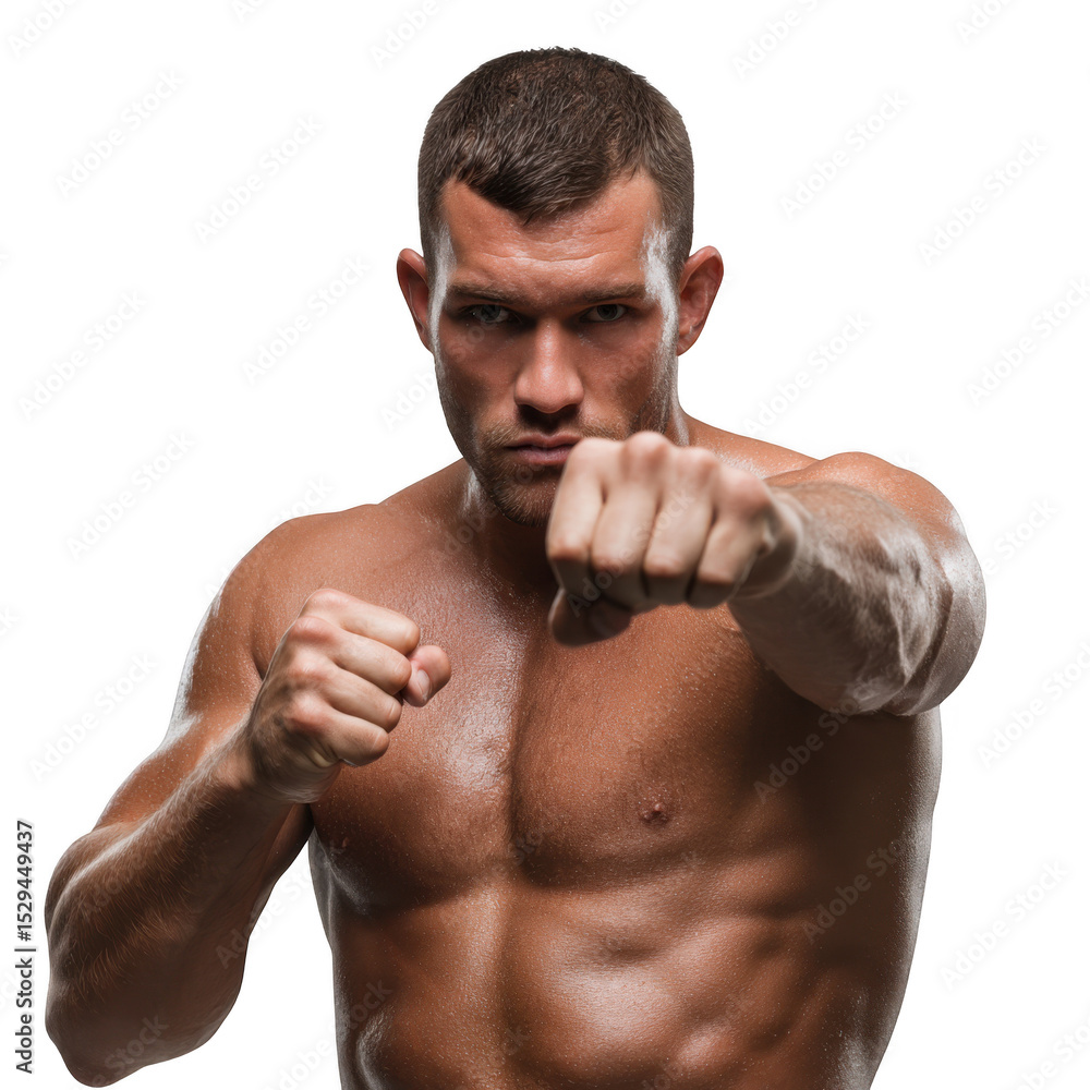A muscular man with clenched fists in a fighting stance against a black background in a studio shot #1529449437