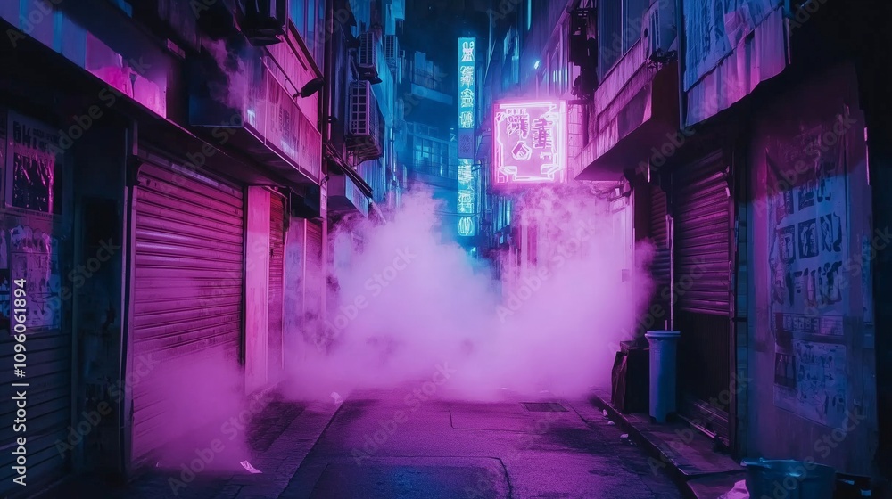 A neon-lit cyberpunk alley with glowing pink and blue signs, foggy atmosphere, and deserted streets, creating a mysterious and futuristic urban aesthetic #1096061894