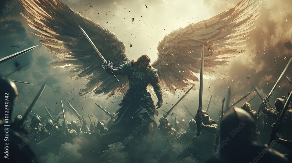 A powerful angel with majestic wings stands ready for battle amidst a fierce scene of warriors and swords, embodying strength and courage. #1012790742