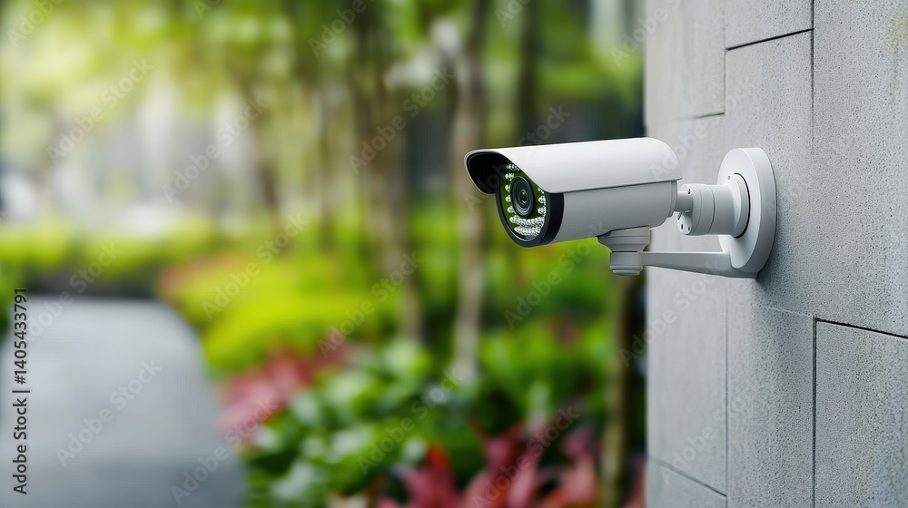 A security camera mounted on a wall overlooks a lush garden pathway, blending technology with nature. #1405433791