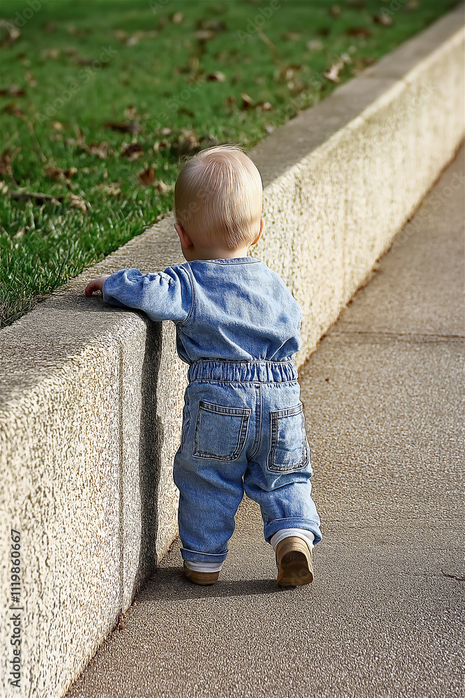 A toddler learning to walk near a pavement edge on a sunny day, symbolizing growth, determination, and early childhood milestones. #1119860667