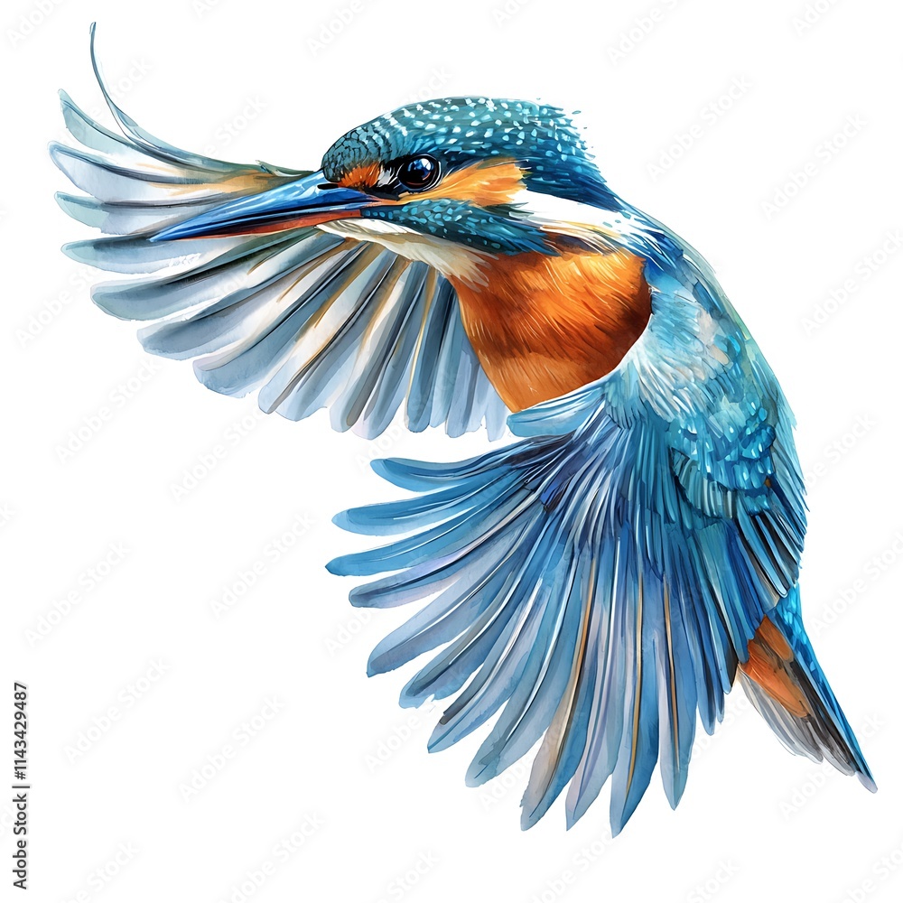A Vibrant Artistic Rendering of a Kingfisher in Flight Against a White Background. #1143429487