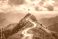 A winding road ascending a steep, isolated mountain peak topped with a flag, symbolizing the challenging journey to success #880184463
