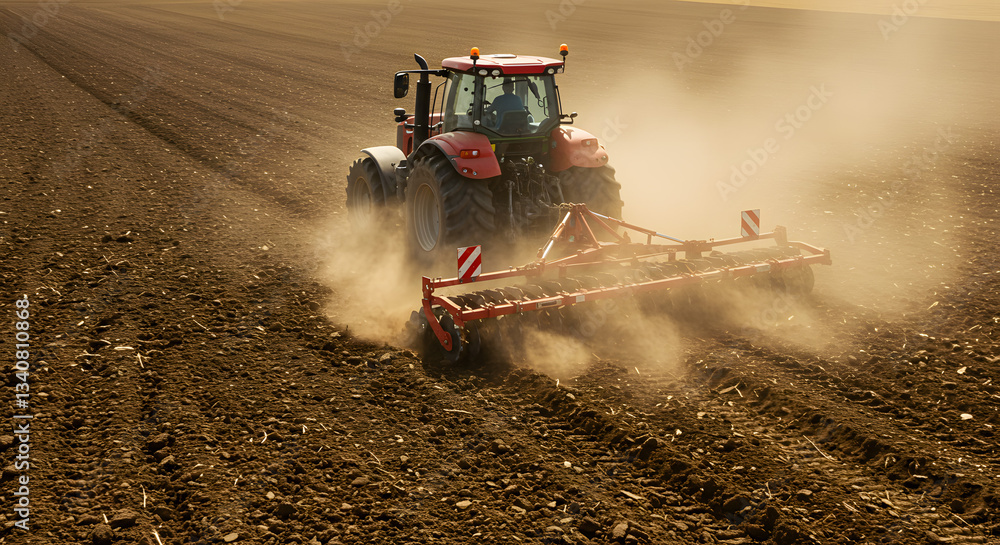 Agricultural Prowess: A vibrant, red tractor efficiently tills the fertile earth of a vast field, kicking up a cloud of dust, readying the land for cultivation, under the sun. #1340810868