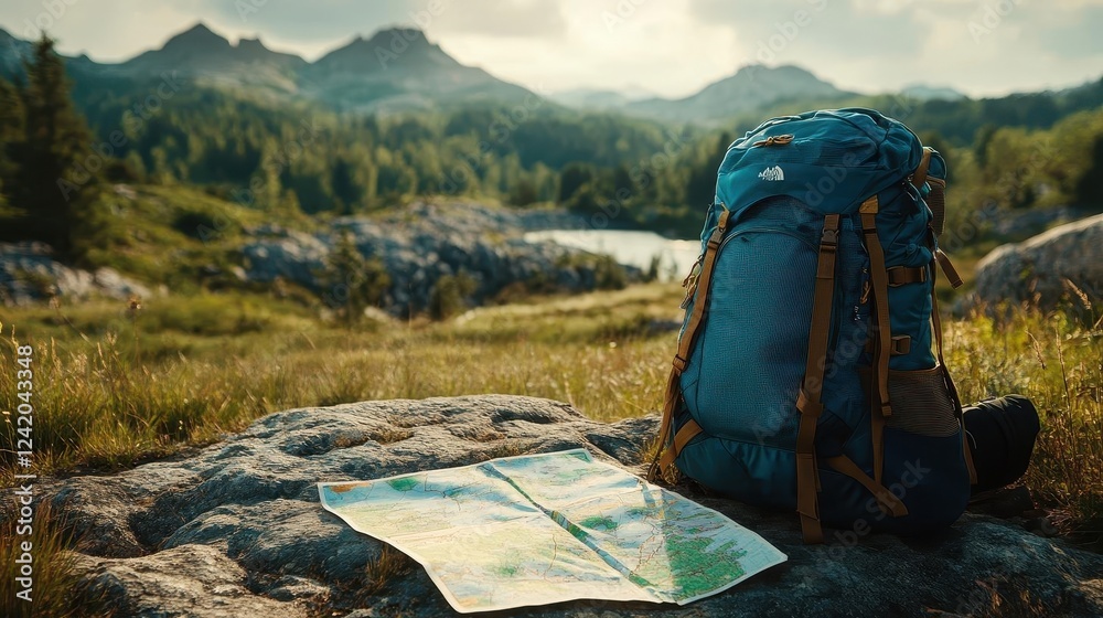 Backpacking adventure, close-up of backpack and map, scenic trail in background #1242043348